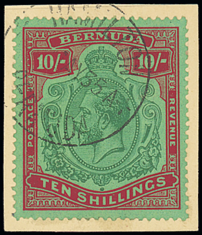 10/- green and deep red on emerald, 8th. printing (September 1931), fine used on piece with Hamilton c.d.s.. Photo