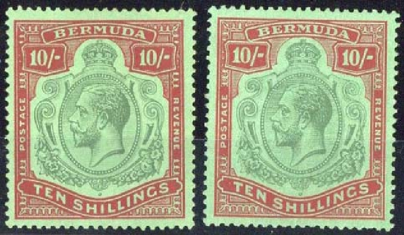 10/- green and red on emerald, 9th. printing (August 1932), two shades, fine mint