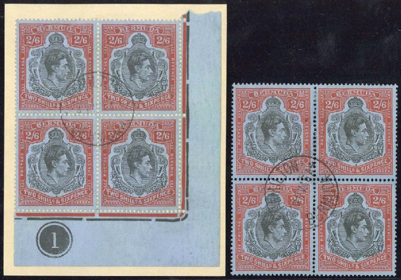 Carmine-red and black (blurry impression) on grey-blue lower right corner plate block of four with FF48, used on piece with central Hamilton 1944 c.d.s., and a further block of four in a slightly different shade with central Hamilton 1946 c.d.s.; fine and scarce