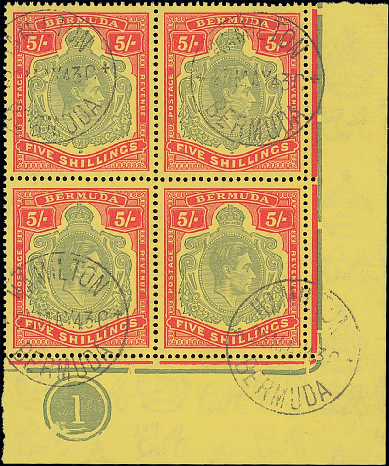 Bronze-green and carmine-red on pale yellow lower right corner plate block of four, [47-60], with HPF47a, 59ii broken top right scroll repair and 60 broken lower right scroll, each neatly cancelled by Hamilton May 1943 c.d.s. Exceptionally rare and believed to be the sole recorded used plate block of this printing. S.G. 118c, ce. Photo