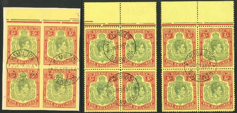 A trio of used marginal blocks comprising 9th., [5-18] and 10th., [7-20] and [9-22], neatly cancelled with Hamilton or St. Georges c.d.s., the first on piece; [21] with a thin though of fine appearance. S.G. 118f/g group