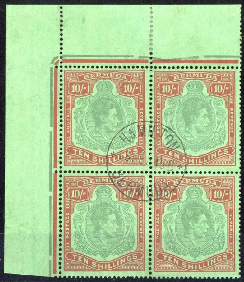 Bluish green and deep red on green upper left corner block of four, [1-14] with HPF1a and FF13, cancelled with central Hamilton 1945 c.d.s.; traces of discolouration in margins and [13] with one short perf. at foot, otherwise fine