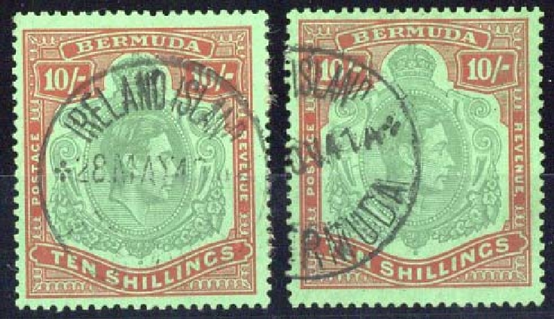 Bluish green and deep red on green, two singles, one FF37, both with Ireland Island c.d.s.; fine