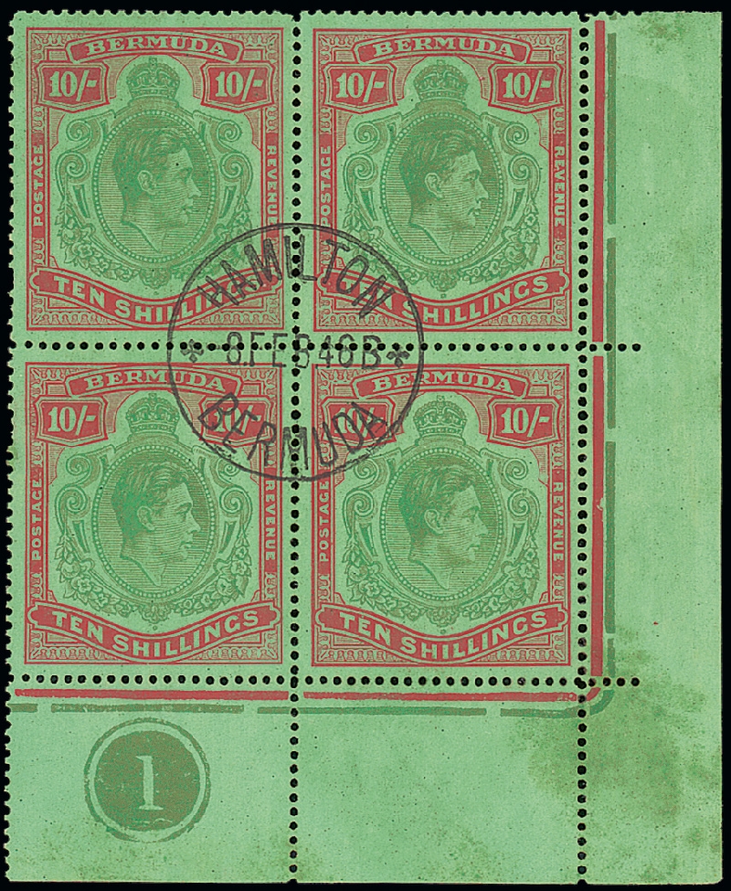 Yellow-green and carmine on green lower right corner plate block of four, [47-60] with HPF47a, 47b, 59 broken top right scroll and 60 broken lower right scroll, superb central Hamilton 1946 c.d.s.; left-hand vertical pair with a few small faults and some discolouration in margins though a very rare multiple. S.G. 119b, bd, be, £2,660. Photo