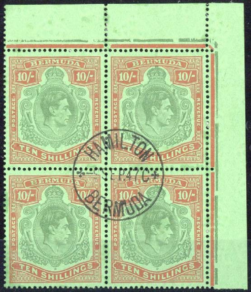 Deep green and dull red on green (emerald back) upper right corner block of four, [11-24] with HPF12b, neat central Hamilton 1947 c.d.s.; fine