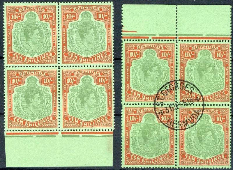 Green and vermilion on green marginal block of four, [39-52] with HPF39, 40a, 52a, unmounted mint and marginal block of four, [7-20] used with central St. Georges 1951 c.d.s.; fine. S.G. 119e