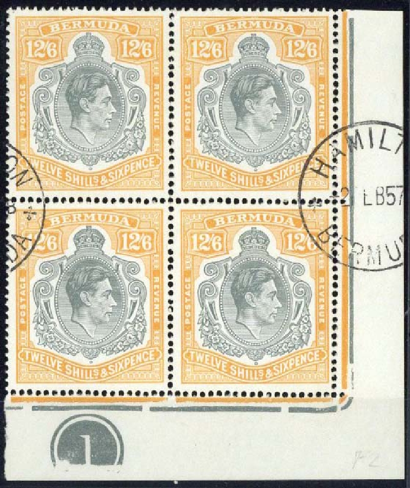 Grey and deep yellow-orange lower right corner plate block of four, [47-60] with HPF47a and 59b, used with two part Hamilton 1957 c.d.s.; fine and scarce used