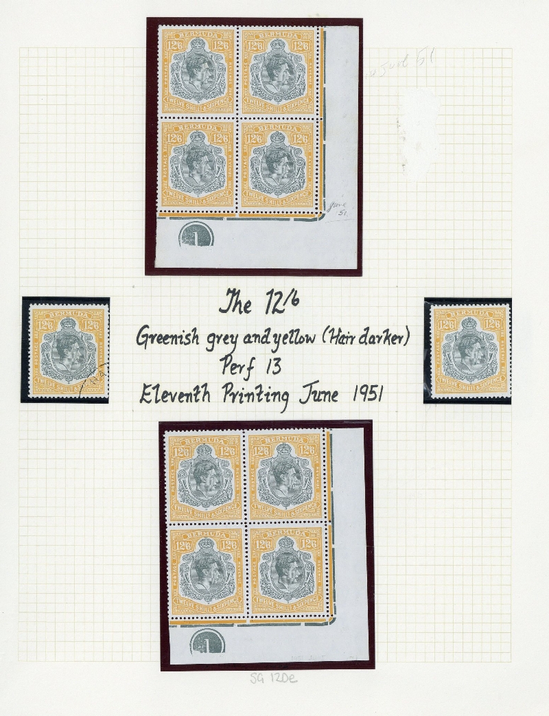 The balance of the 12/6d. collection, apparently covering nearly all printings, largely mint and including first five printings with brown gum mint (32, one perforated "specimen", a vertical strip of five and three blocks of four) and used (12 with a pair), later printings with clear gum mint (26 with a corner block of nine, two blocks of four and one with HPF60 broken lower right scroll - thin) and used (9, one a yellow with BPA Certificate - 1992) and perf. 13 shades mint ( 24 with four blocks of four, three with plate number) and used (5); several of the early printings with toning, etc., the later perf. 14 stamps and perf. 13 stamps generally good to fine