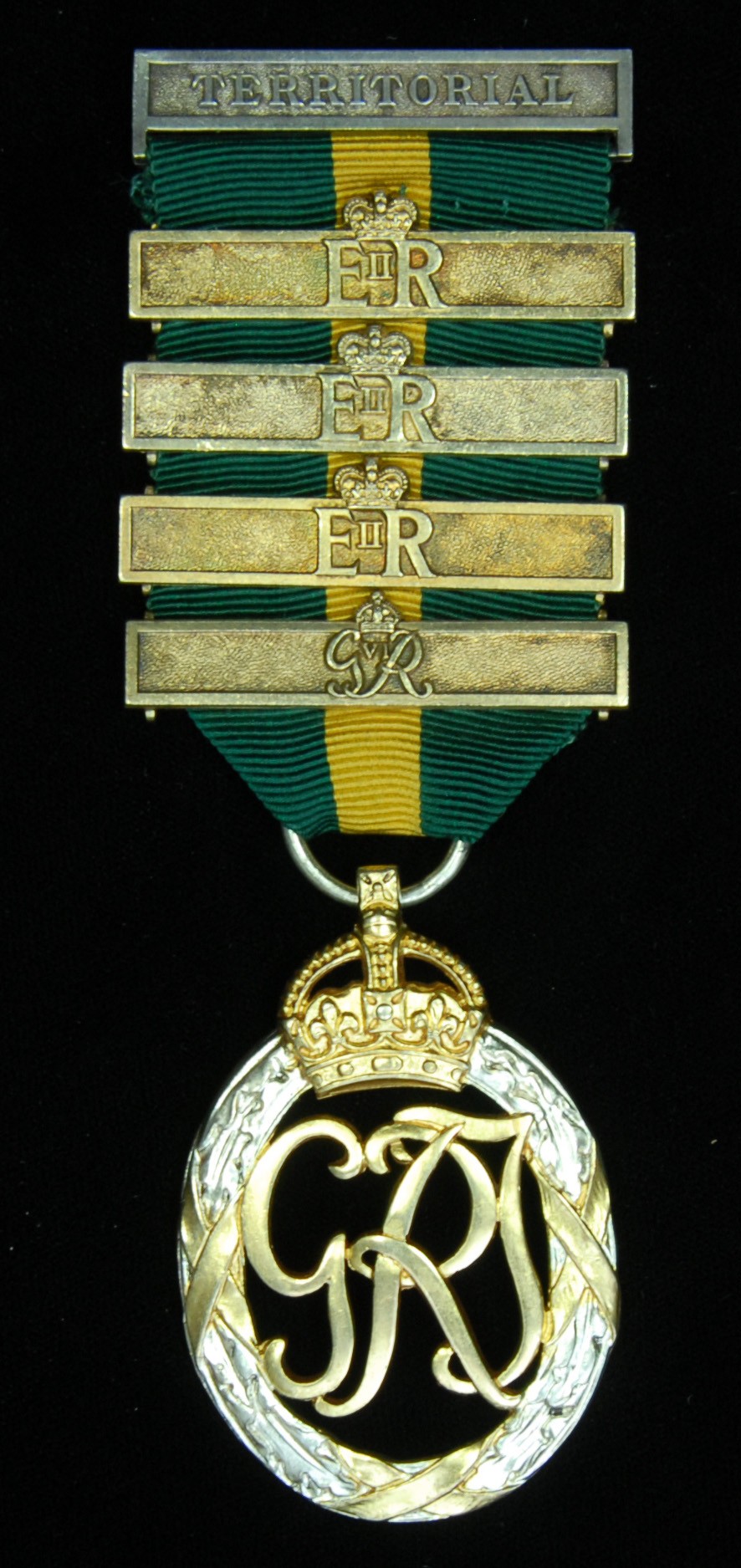 Efficiency Decoration, G.VI.R., silver and silver-gilt, reverse officially dated 1947, with four Additional Long Service Bars, G.VI.R. dated '1951', E.II.R. dated '1952, E.II.R. dated '1957', and E.II.R. dated '1962', with integral top 'Territorial' riband bar, nearly extremely fine