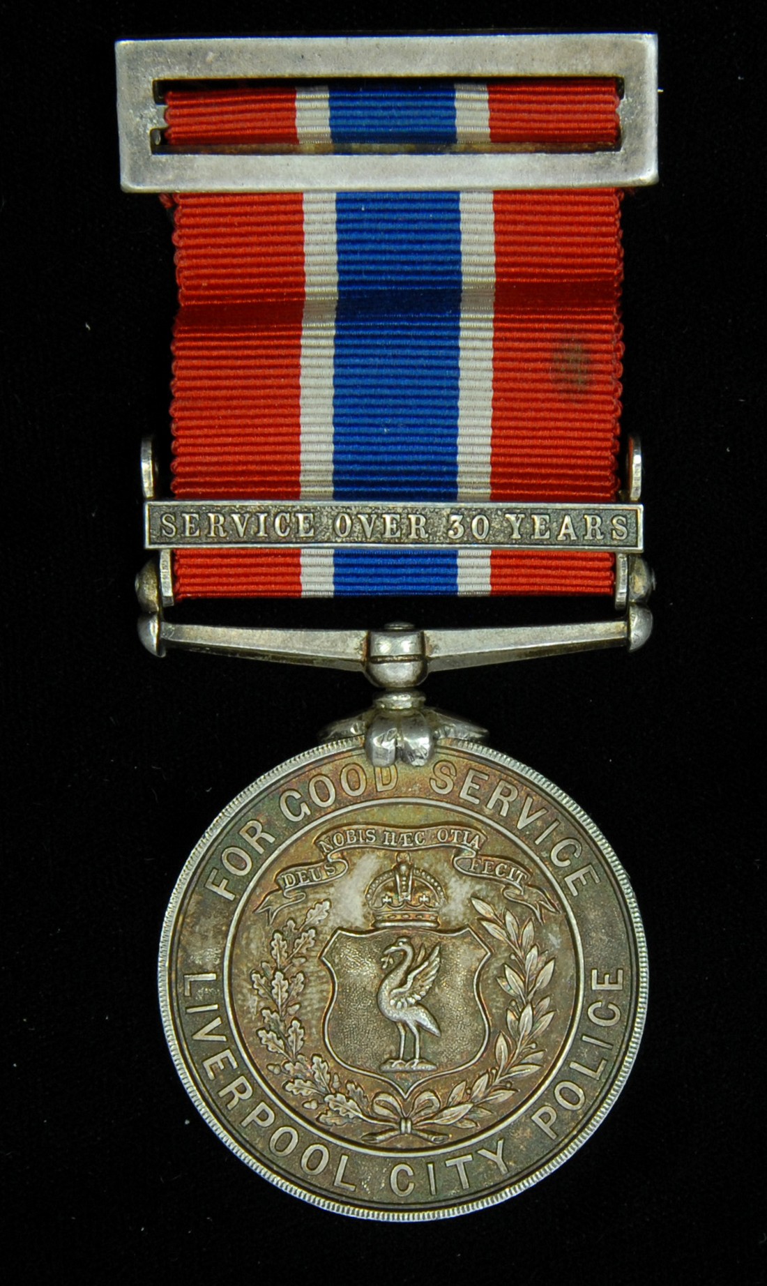 Liverpool City Police Good Service Medal, silver, with 'Service Over 30 Years' clasp, reverse engraved 'Presented by Watch Committee To Con. 210.K. J.A. Airey 20-8-44', good very fine, with integral top riband brooch bar