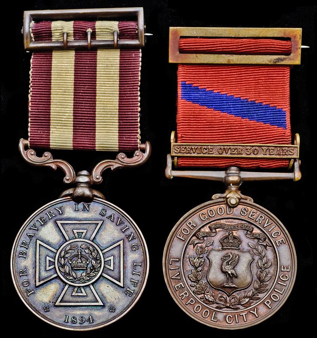 Liverpool Shipwreck and Humane Society General Medal, bronze (To P.S. 12F William Wyall [sic], For Gallant Service. 14th. December 1907.), with integral top riband buckle; Liverpool City Police Good Service Medal, bronze, with 'Service Over 30 Years' clasp, reverse engraved 'Presented by The Watch Committee 30 November 1914', edge engraved 'P.S. 28E. William Wyatt', with integral top riband brooch bar, good very fine, both in cases of issue (2)