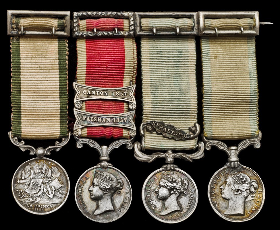 Baltic 1854; Crimea 1854-56, one clasp, Sebastopol; China 1857-60, two clasps, Fatshan 1857, Canton 1857; Turkish Crimea, Sardinian die, nearly very fine or better, all with contemporary Hunt and Roskell top silver riband buckles, the first three mounted together in reverse order (4)
