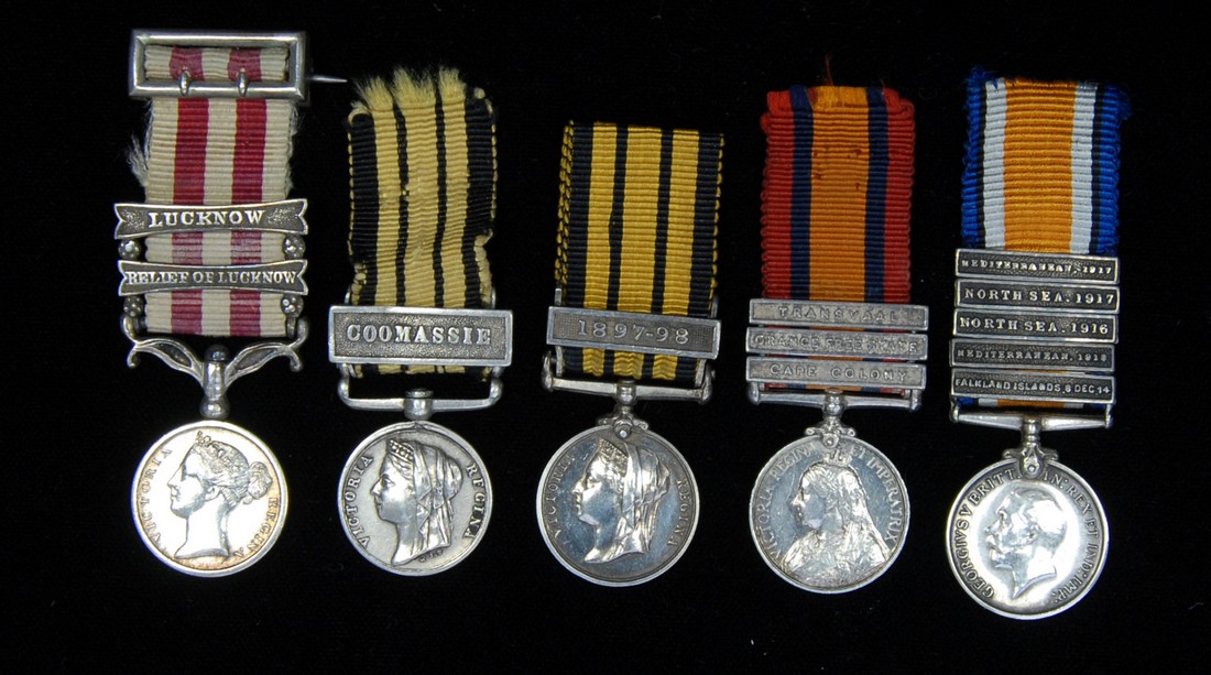 Miniature Awards: India General Service 1854-95, one clasp, Bhootan, with Hunt and Roskell top silver riband buckle, with gold retaining pin; Turkish Crimea, Sardinian die; Indian Mutiny 1857-58, two clasps, Lucknow, Relief of Lucknow, clasps mounted in this order, with top silver riband buckle; New Zealand 1845-66, undated reverse; Ashantee 1873-74, one clasp, Coomassie; Afghanistan 1878-80, one clasp, Kandahar; Kabul to Kandahar Star 1880; Egypt 1882-89, dated, no clasp; Khedive's Star 1882; East and West Africa 1887-1900, one clasp, 1897-98; Queen's South Africa 1899-1902, three clasps, Cape Colony, Orange Free State, Transvaal (3); British War Medal, five clasps, Falkland Islands 8. Dec. 14, Mediterranean 1918, North Sea 1916, North Sea 1917, Mediterranean 1917, genertally good very fine (14)