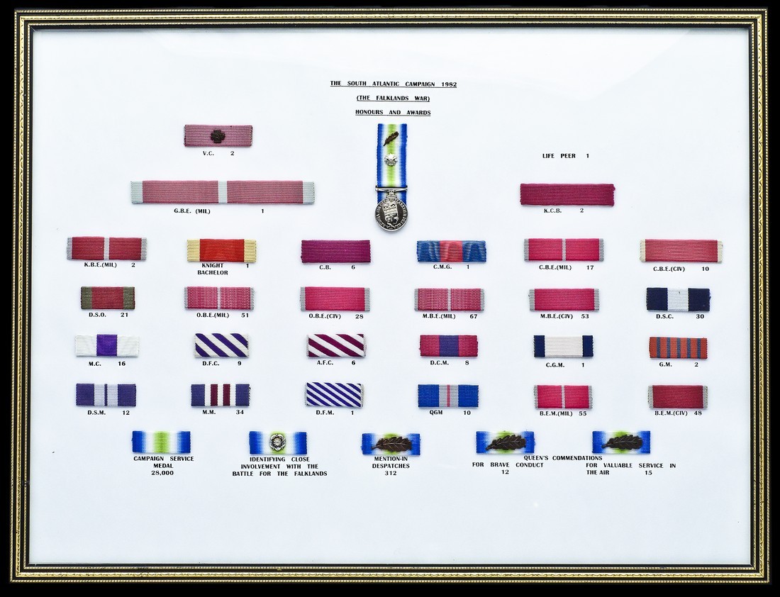 A riband chart comprising the ribands of all 32 Honours and Awards given during the Falklands War 1982, including the Defence and Repossession of South Georgia, together with the numbers of each awarded, starting with the riband for the Victoria Cross awarded to Lieutenant-Colonel Herbert Jones and Sergeant Ian McKay, complete with emblem; and ending with the riband for the South Atlantic Medal 1982, complete with rosette and Mentioned in Despatches, Queen's Commendation for Brave Conduct, and Queen's Commendation for Valuable Service in the Air emblems, the centrepiece of the display being a miniature South Atlantic Medal, with rosette and M.I.D. Oak Leaf, mounted in a glazed frame, together with a copy of the relevant London Gazette, 8.10.1982, giving full citations