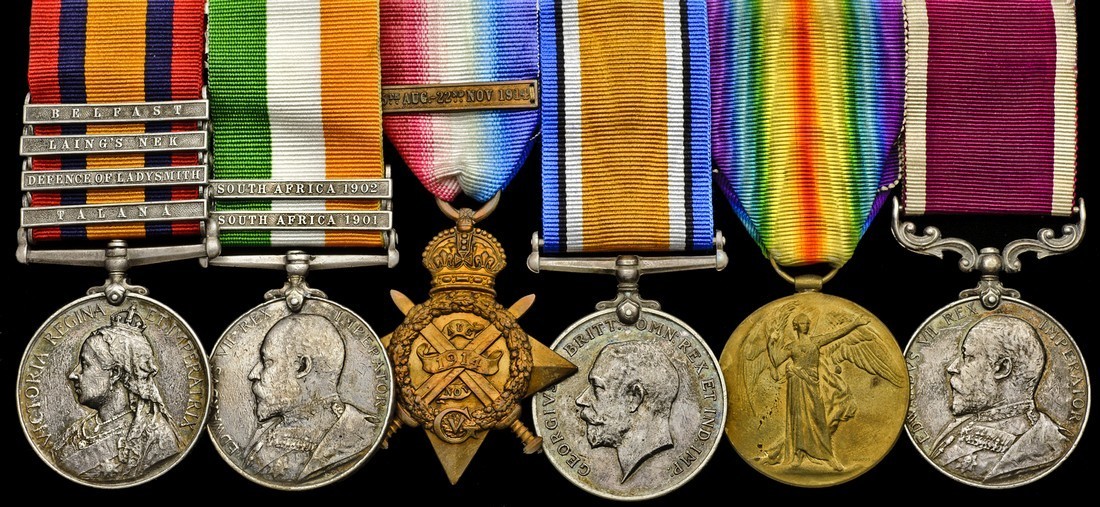 Queen's South Africa 1899-1902, four clasps, Talana, Defence of Ladysmith, Laing's Nek, Belfast (3313 Bndsmn: W.W. Porter, 1: Leic: Regt.); King's South Africa 1901-02, two clasps (3313 Pte. F.W.W. Porter. Leicester: Regt.); 1914 Star, with Bar (3313 L.Cpl. F.W. Porter. 1/Leic: R.); British War and Victory Medals (3313 Cpl. F.W.W. Porter. Leic. R.); Army Long Service & G.C., E.VII.R. (3313 Pte. F.W.W. Porter. Leic: Regt.), heavy contact marks to three pre-Great War medals, these good fine, the Great War awards very fine (6)