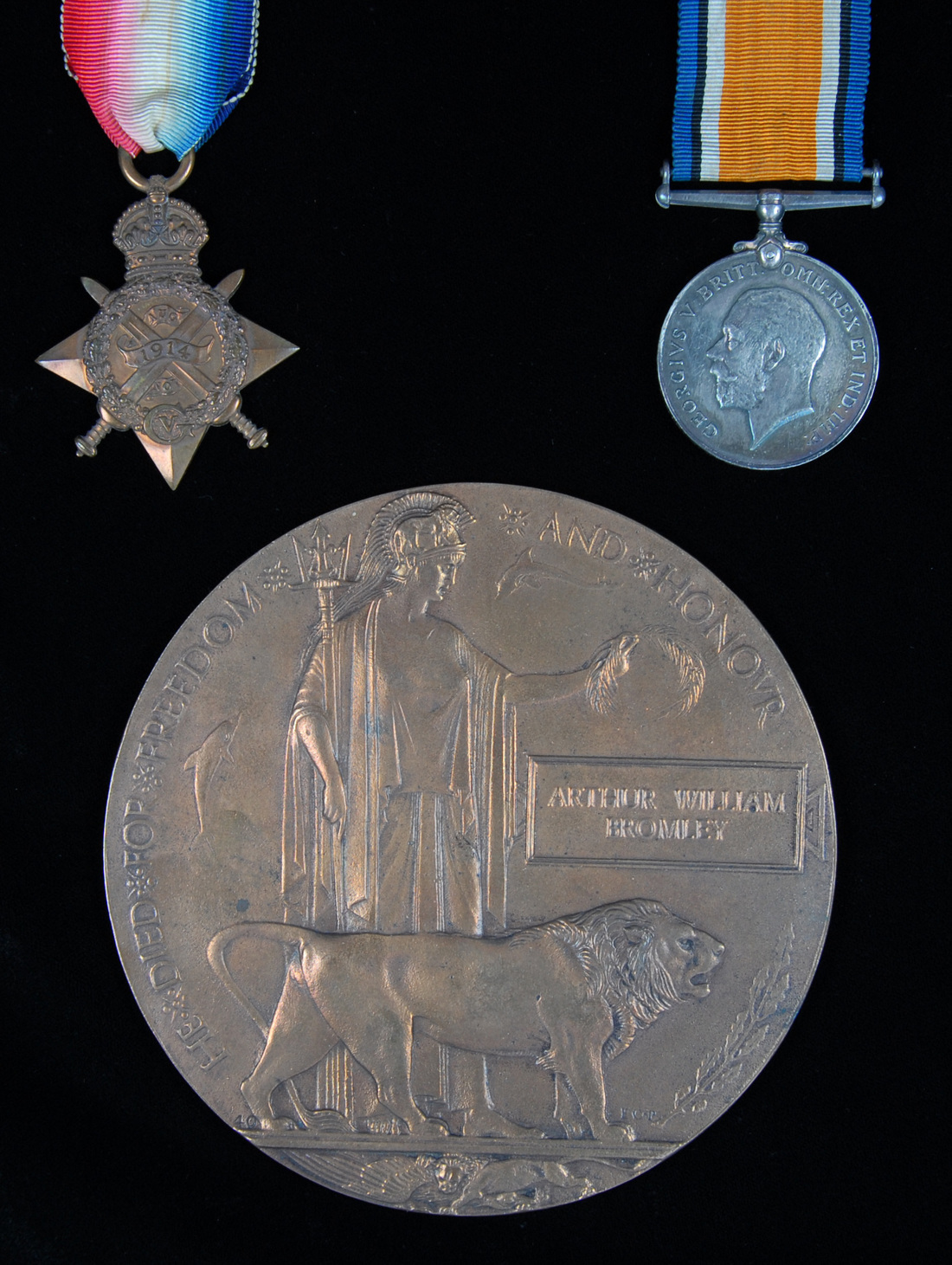1914 Star (9753 Pte. A.W. Bromley. 1/S. Staff: R.); British War Medal (9753 Pte. A.W. Bromley. S. Staff. R.), extremely fine, together with the recipient's Great War Bronze Memorial Plaque (Arthur William Bromley) (3)