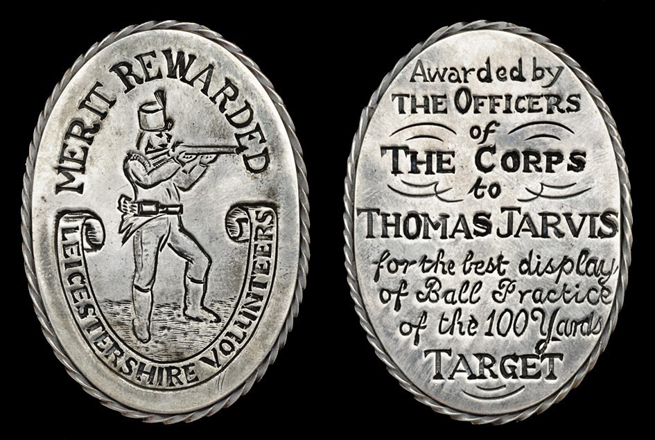 Leicestershire Volunteers Medal, an oval engraved medal with roped border, 51mm x 36mm, silver, obverse featuring a Militiaman in the standing firing position, 'Merit Rewarded' inscribed above, 'Leicestershire Volunteers' inscribed within scroll below, reverse inscribed 'Awarded by The Officers of The Corps to Thomas Jarvis for the best display of Ball Practice of the 100 Yards Target', good very fine