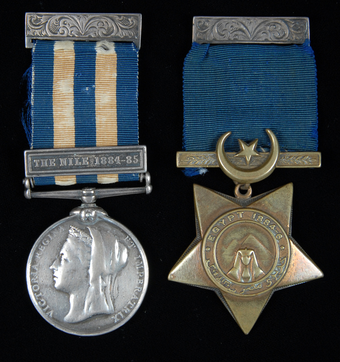 Egypt 1882-89, undated, one clasp, The Nile 1884-85 (947. Pte. W. Hand. 1/R. W. ..nt. R.), suspension re-affixed, edge details worn; Khedive's Star 1884-6, good fine, both with ornate top silver riband bars (2)