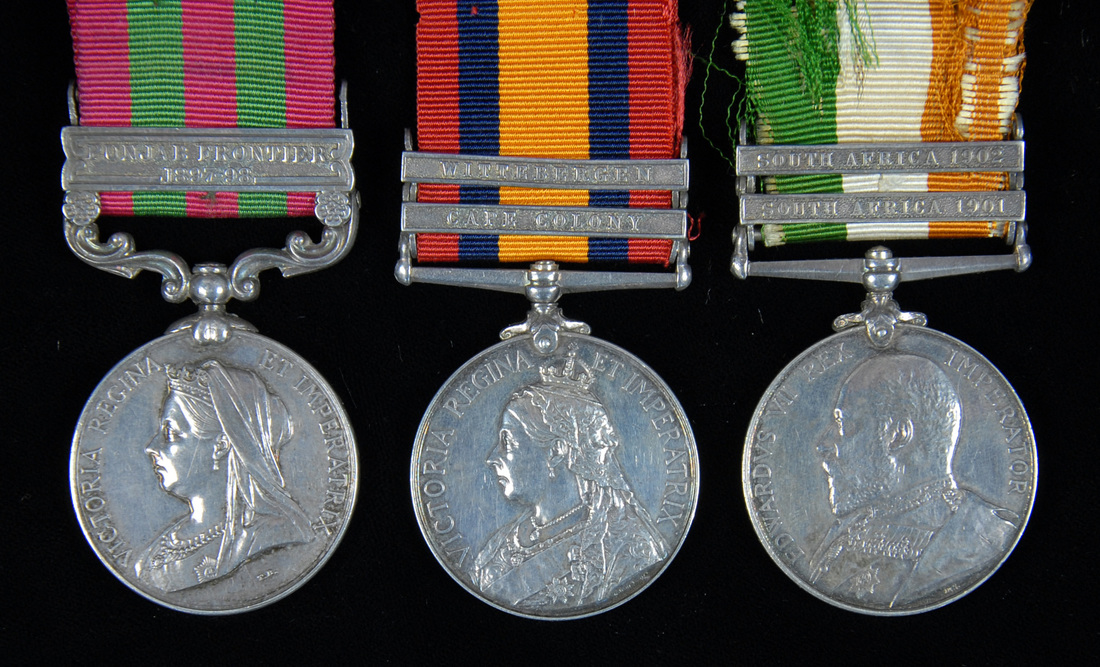 India General Service 1895-1902, V.R., one clasp, Punjab Frontier 1897-98 (3223 Pte. A [sic]. Aubury 1st Bn. Ryl. W. Kent Regt.), minor official correction to number; Queen's South Africa 1899-1902, two clasps, Cape Colony, Wittebergen (3223 Pte. H. Aubury 2nd Rl. W. Kent Regt), officially renamed, rivets refurbished; King's South Africa 1901-02, two clasps (3223 Pte. H. Aubury. Rl. W. Kent Regt), generally very fine or better (3)