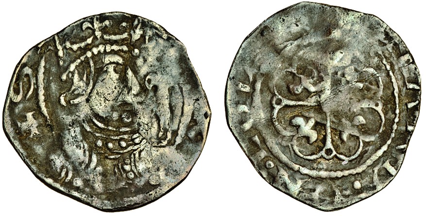Stephen (1135-54), Penny, 1.08g, 'Watford' type (BMC 1), Colchester, Edward, crowned bust right, sceptre before, rev. +[..]þard:on:col, cross moline, fleur in each angle (N.873; S.1278), lightly crimped, nearly very fine, rare for this mint