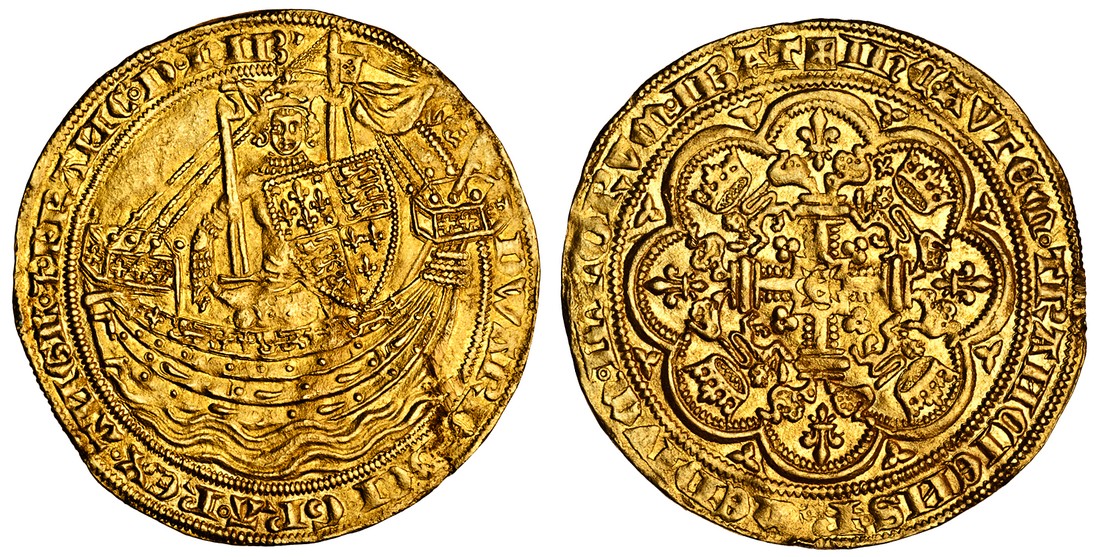 Edward III (1327-77), fourth coinage, 1351-77, pre-treaty period, 1351-61, Noble, 7.76g, London, series B/C mule, m.m. cross 1, king, crowned, standing facing in ship holding sword and shield, franc, single annulet stops, open e and c, rev. floriate cross, arms extending from a central panel containing a letter e, small lis added in second quarter, single annulet stops, closed e and c, Lombardic m, single annulet stops (cf Schneider 15; N.1138/1144; S./1484/1486), graze at 5 o'clock on obverse, slight crease, good very fine, a rare mule