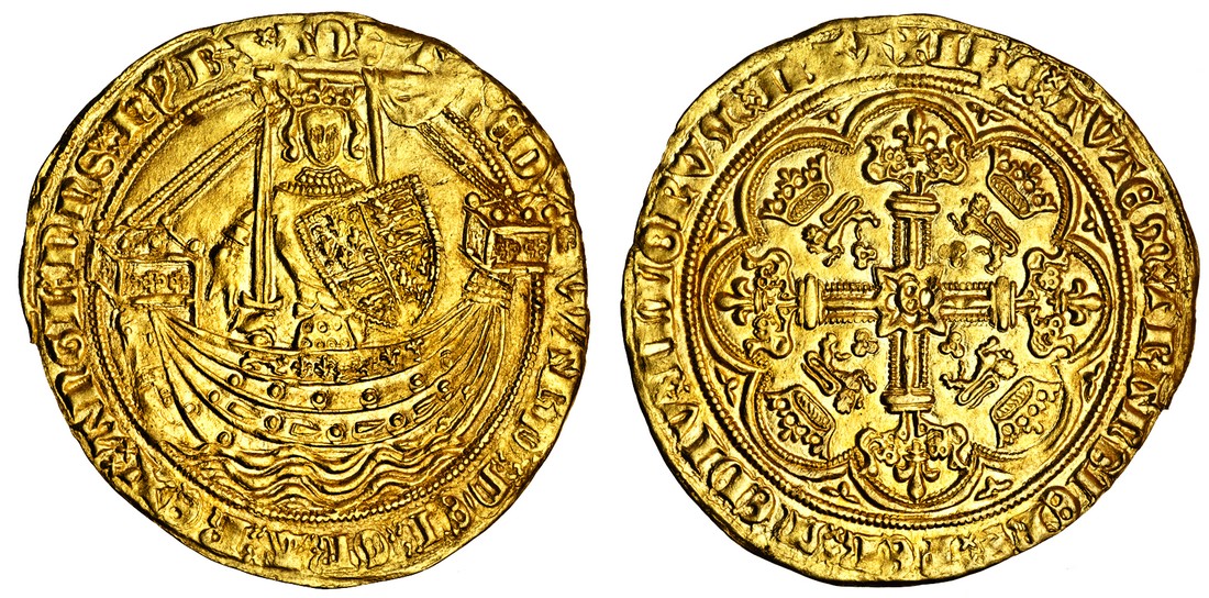 (x) Edward III, fourth coinage, 1351-77, treaty period, 1361-69, Noble, 7.73g, London, m.m. cross 4, king, crowned, standing facing in ship holding sword and shield, aq/t, rev. floriate cross arms extending from a central panel containing a letter e (Schneider 75; N.1231; S.1502), double struck in legend on obverse, nearly extremely fine