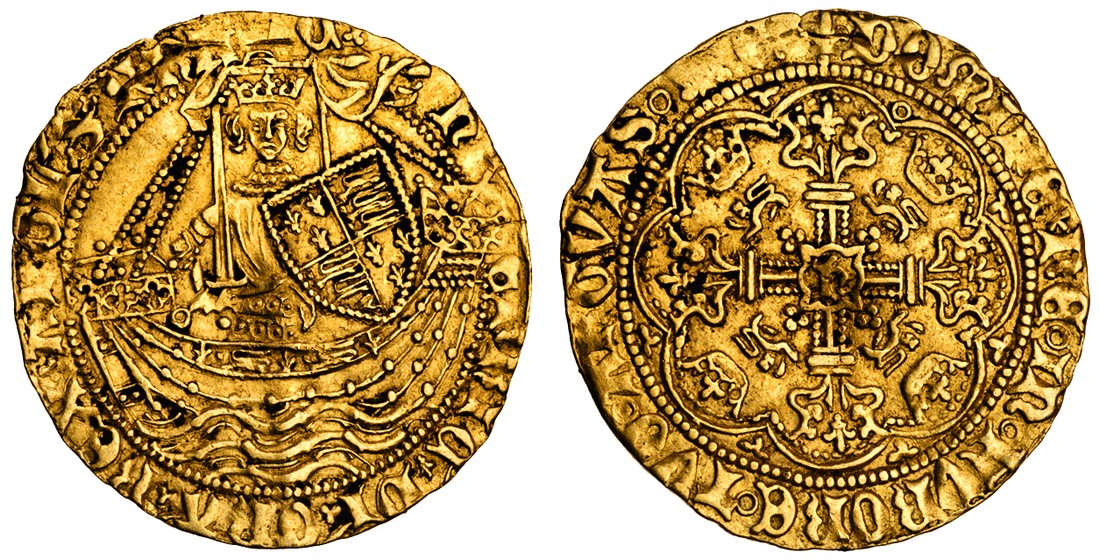 Henry VI (first reign, 1422-61), annulet issue, 1422-c.1430, Half-Noble, 3.47g, London, m.m. lis, king, crowned, standing facing in ship holding sword and shield, franc, rev. floriate cross extending from a central panel containing a letter h (cf Schneider 292-94; N.1417; S.1804), crease, nearly very fine