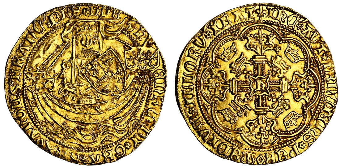 Henry VI, first reign, rosette-mascle issue, c.1430-31, Noble, 6.94g, London, m.m., lis, king crowned, standing facing in ship holding sword and shield, mascle after rex, rosette stops, rev. floriate cross arms extending from a central panel containing a letter h, added small lis in second quarter, mascle after per, trnciens, rosette stops (Schneider 308; N.1439; S.1817), slightly double struck in places on obverse, very fine, rare