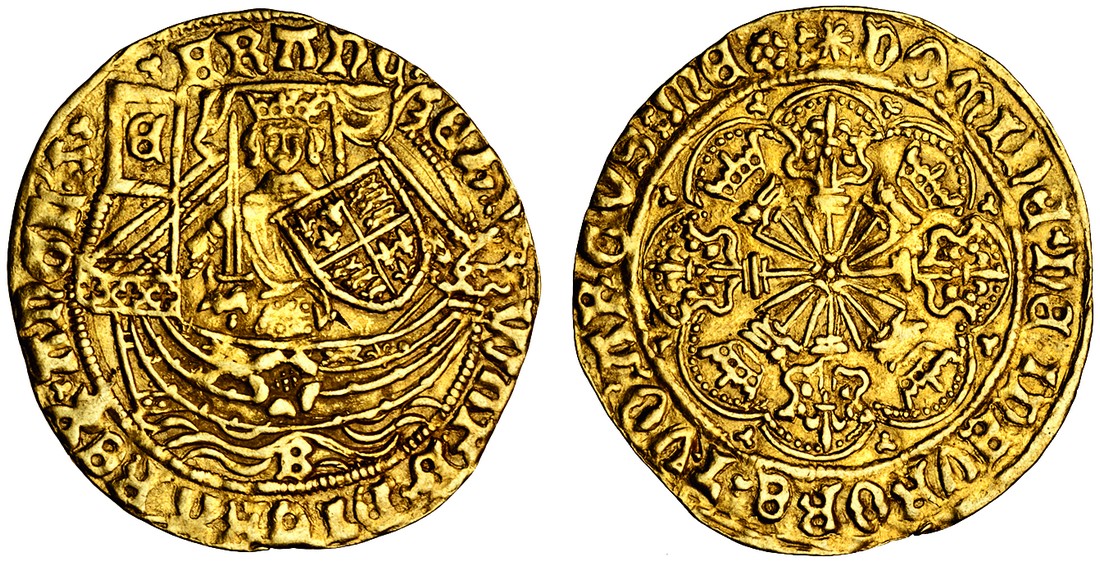 Edward IV, first reign, light coinage, 1464-70, Half-Ryal, 3.81g, Bristol, m.m. sun, king, crowned, standing facing in ship with sword and shield, flag at stern, rose on hull, b below in waves, rev. rose on radiant sun over floriate cross, crowned leopards in angles, argvs, rose after me (cf Schneider 420; N.1555; S.1960), very fine, very rare