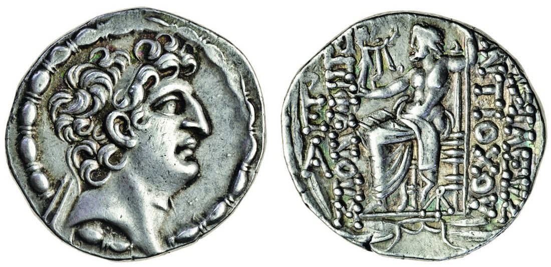 Kingdom of Syria, Antiochos VIII, Epiphanes (Grypos) (c.121-96 BC), AR Tetradrachm, 16.21g, Antioch, c.109-96 BC, diademed head right, rev. Zeus Nikephoros enthroned left, monograms on left and below throne, all in wreath (Seleucid Coins 2309.2; SMA 405), toned, good very fine