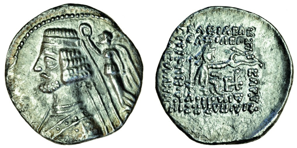Kingdom of Parthia, Orodes II (57-38 BC), AR Drachm, 2.97g, Ekbatana, diademed bust left, Nikes behind holding wreath above, Arsakes seated right, inscription around (Sellwood 42.2; Shore 281 var.), nearly extremely fine, rare