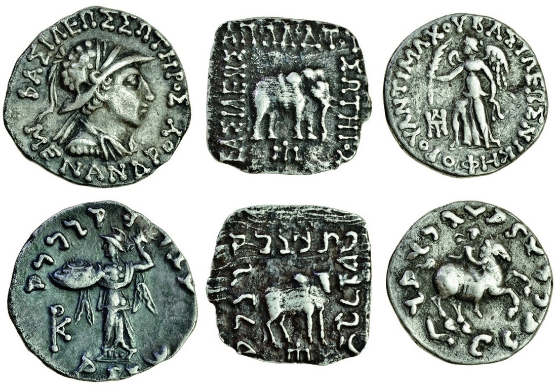 Kingdom of Bactria, Bilingual AR Drachms (3), Apollodotos I (c.180-160 BC), elephant right, monogram below, rev. zebu standing right, monogram below (SNG ANS 337-343; BN 4F), very fine, Antimachos II (160-155 BC), Nike standing left, holding palm-branch and fillet, monogram before, rev. king on horseback right (SNG ANS 424-5; BN 1G), about very fine, Menander I (c.155-130 BC), draped bust right, wearing crested helmet, rev. Athena Alkidemos walking left, holding shield and hurling thunderbolt (SNG ANS 867; BN 16E), very fine (3)