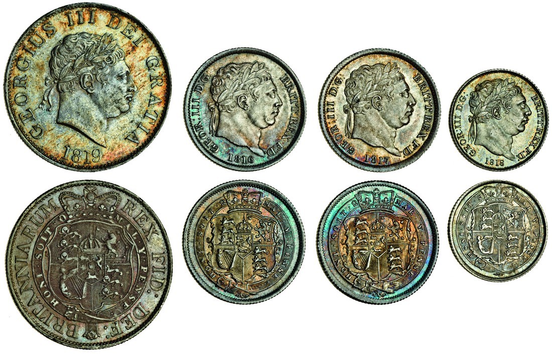 George III (1760-1820), Halfcrown, 1819 (ESC 623; S.3789), toned, very fine or better, Shillings (2), 1816, 1817 (ESC 1228, 1232; S.3790), toned, extremely fine, Sixpence, 1818 (ESC 1634; S.3791), toned, extremely fine (4)