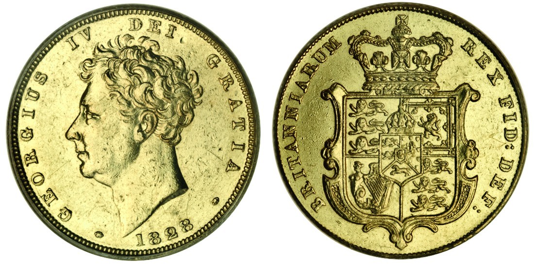 (g) George IV (1820-30), Sovereign, 1828, bare head left, rev. crowned garnished shield (Marsh 13; S.3801), in PCGS holder graded AU53, very rare