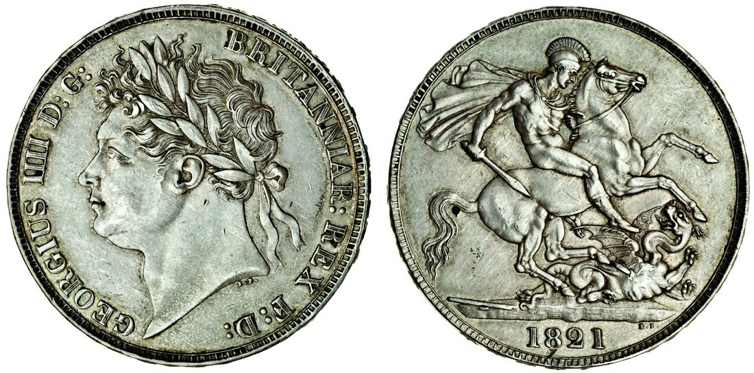George IV (1820-30), Crown, 1821 secundo, laureate head left, rev. St George and dragon (ESC 246; S.3805), previously cleaned and toned, some digs, small punchhole below the tail, good very fine