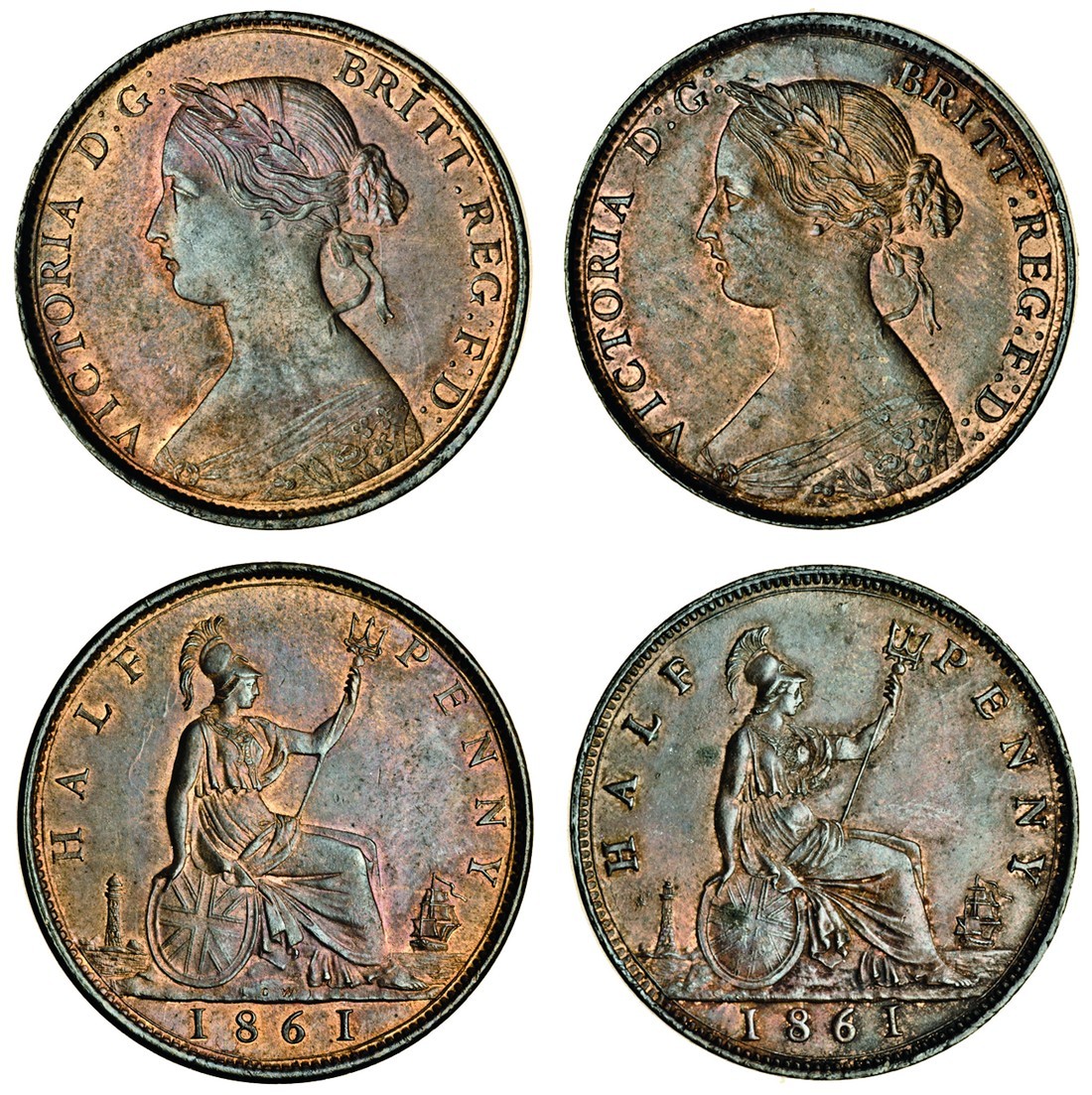 Victoria (1837-1901), 'bun' head Halfpennies (11), 1861 dies 4+E, lcw incuse on rocks, 1861 dies 4+G, door on lighthouse, 1861 dies 4+G, misaligned date, 1861 dies 5+E, lcw incuse on rocks, 1861 dies 5+G, door on lighthouse, 1861 dies 6+E, lcw incuse on rocks, 1861 dies 6+E, first 1 in date over struck and touches groundline, 1861 dies 6+G, door on lighthouse, 1861 dies 7+D, 16 leaves, 1861 dies 7+F no hemline to drapery, 1861 dies 7+G, door on lighthouse, rev. Britannia seated right (F.270, 273, 274, 275, 276, 277, 278, 279, 282; S.3956), some with lustre, some with carbon spots and finger print, good very fine to about uncirculated (11)