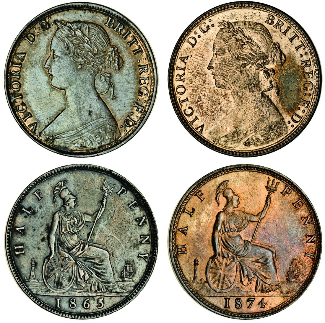 Victoria (1837-1901), 'bun' head Halfpennies (14), 1865 dies 7+G, 5 over 3, 1871 dies 7+G, 1874 dies 7+J, narrow date, 1874 dies 8+J, 1874 dies 9+I, older features, 1874 dies 9+J, narrow date, 1874 dies 9+K wide date, 1875 dies 11+L, unrecorded die pairings, 1875 dies 12+J, unrecorded die pairings, 1878 dies 15+N, wide date, 1883 dies 19+S, rose for brooch, 1892 flan flaw on reverse rev. Britannia seated right (F.297, 308, 312, 315, 316, 335, 351; S.3956), with a Brockage obverse 7 and a Halfpenny imitation by Lauer some with lustre, some carbon spots and fingerprint, fair to good extremely fine (14)