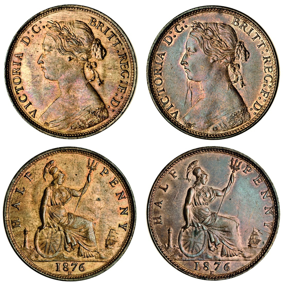 Victoria (1837-1901), 'bun' head Halfpennies (17), 1876H dies 13+K*, 1876 H dies 13+M, 1876 H dies 14+K*, 1876 H dies 14+M (2), one with unbarred h, 1877 dies 13+J, 1877 dies 14+J, 1877 dies 14+N, 1878 dies 14+O, 1878 15+O, 1879 dies 14+O, 1879 dies 15+O (2), one with thicker legend and date, 1880 dies 15+P, 1881 dies 15+O, 1881 dies 15+O* unrecorded die pairing, 1881 H dies 16+Q, h touches date, rev. Britannia seated right (F. 325, 326, 328, 329, 330, 332, 333, 334, 337, 338, 339, 340, 342, 344; S.3956, 3957), some with lustre and with carbon spots, fine to good extremely fine (17)