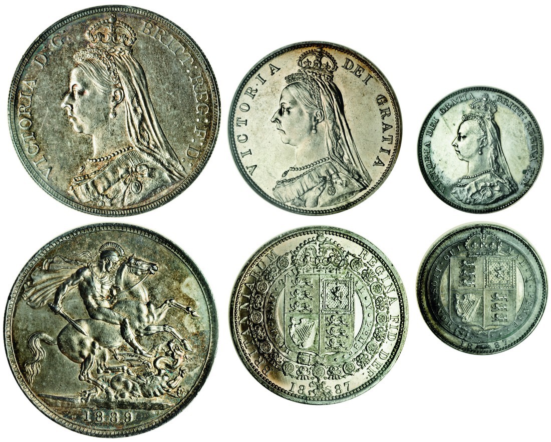 Victoria (1837-1901), Jubilee bust Crown, 1889 (ESC 299; S.3921)in CGS UK holder graded ef70, Jubilee bust Halfcrown, 1887 (ESC 719; S.3924), in CGS UK holder graded au75, Jubilee bust Shilling, 1887 (ESC 1351; S.3926), in CGS UK holder graded unc85 (3)