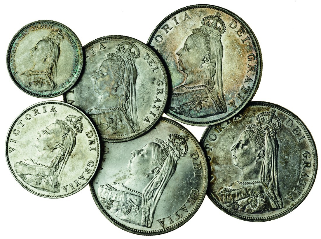 Victoria (1837-1901), Jubilee head, Double Florins (3), 1887 Roman I, 1887 Arabic 1, 1890 (ESC 394, 395, 399; S.3923), 1887 Arabic, resine residue, some toned, extremely fine to good extremely fine, Halfcrown, 1889 (ESC 722; S.3924) about extremely fine, Florin 1887 (ESC 868; S.3925) cleaned, very fine Shilling 1887 (ESC 1351; S.3926), very fine (6)
