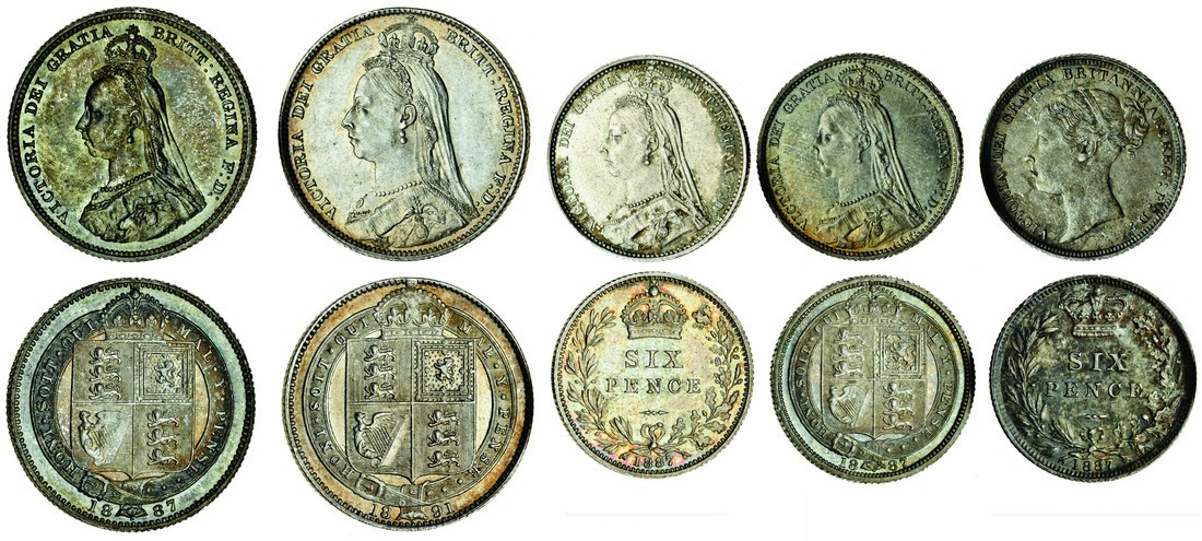 Victoria (1837-1901), Shillings (2), 1887, small Jubilee bust left (ESC 1351; S.3926), 1891, large Jubilee bust left (ESC 1358; S.3927), Sixpences (3), 1887, young head (ESC 1750; S.3912), 1887, Jubilee bust (ESC 1754; S.3929), 1887 'withdrawn' type (ESC 1752; S.3928), toned, some with brilliance, extremely fine to good extremely fine (5)