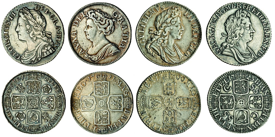 William III, Shilling, 1700 (ESC 1121; S.3516), toned, good very fine, Anne Shilling, 1711, fourth bust (ESC 1158; S.3618), toned, very fine, George I, Shilling, 1723 ssc (ESC1176; S.3647), polished, good very fine, George II, Shilling, 1737 roses and plumes (ESC 1200; S.3700), good very fine (4)