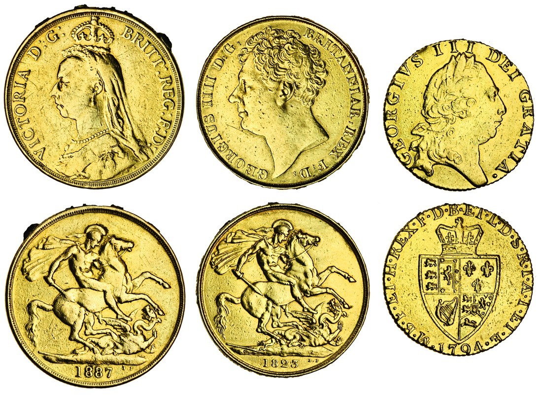 Miscellaneous gold coins (3), George III, Guinea, 1794, George IV, Two-Pounds, 1823, Victoria, Two-Pounds, 1887, all from mounts, polished, good - fine (3)