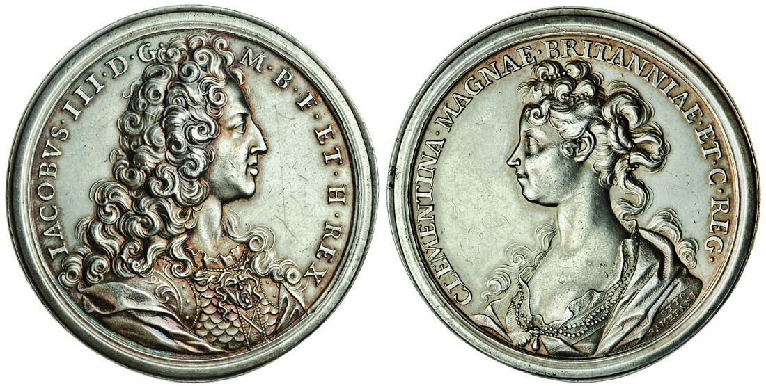 George I, Marriage of James (III) to Princess Clementina, 1719, silver medal by O. Hamerani, 48mm, draped armoured bust right, rev. draped bust left, (E.485; MI 446/52), toned, some marks in fields, good very fine