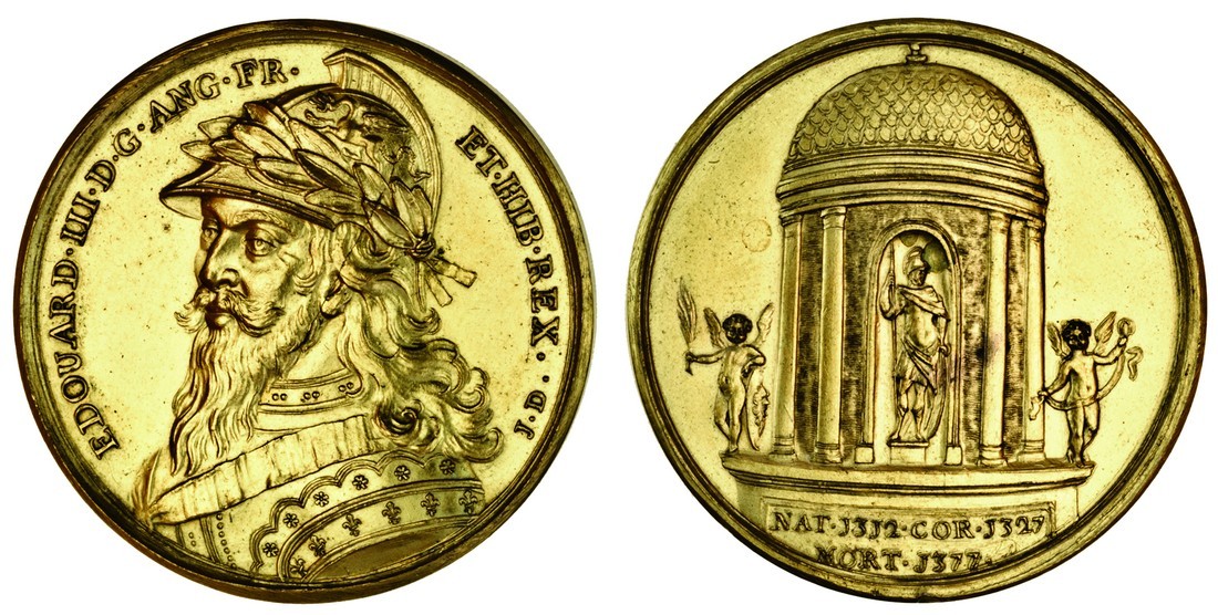 Edward III, gilt bronze medal 1731, by Jean Dassier, helmeted and cuirassed bust left, rev. classical style temple, 41mm. (E.12; MI, i, 3), small mark on reverse edge at 6 o'clock, otherwise extremely fine, scarce
