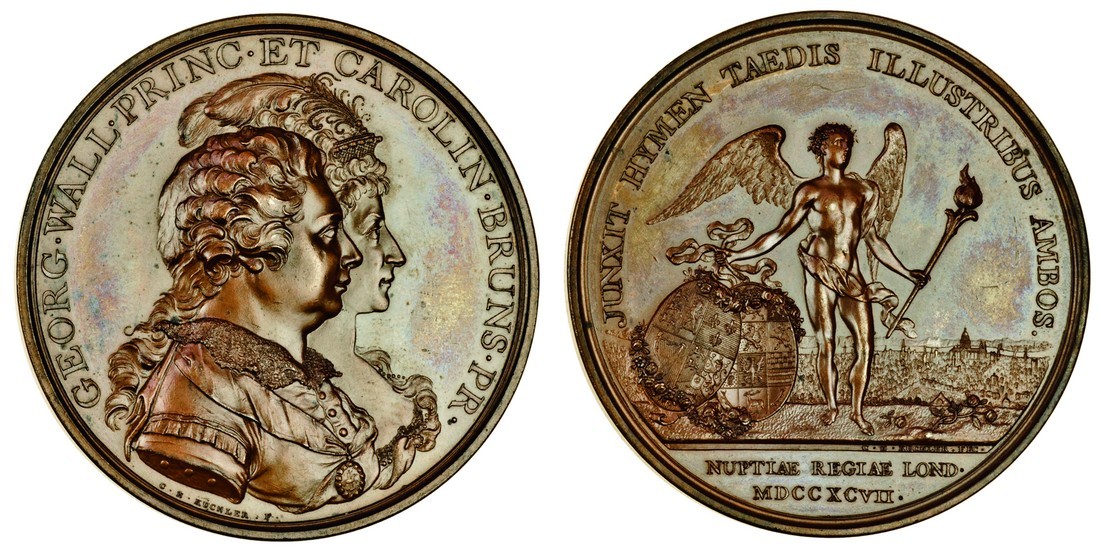 George III, Marriage of George Prince of Wales to Princess Caroline of Brunswick, 1795, bronze medal by C. H. Küchler, busts right, rev. Hymen standing by two oval shields, view of the city of London in the distance, 48mm. (BHM 392; E.865; Pollard 9), extremely fine