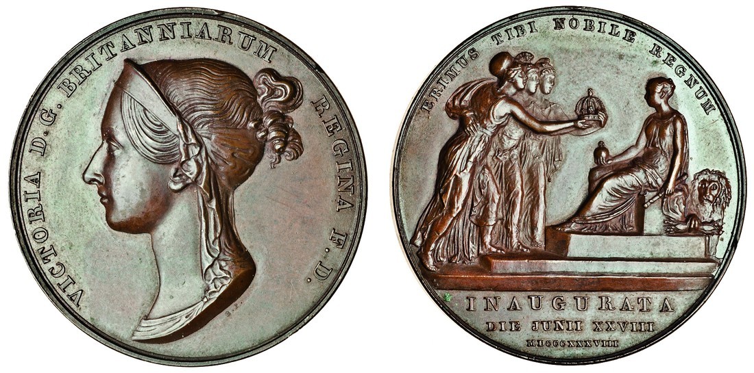 Victoria, Coronation, 1837, bronze medal by B. Pistrucci, draped bust with a bandeau left, rev. Queen enthroned left, receiving a crown from Britannia, Hibernia and Scotia, erimus tibi nobile regnum (BHM 1801; E.1315; W.26), some lustre, edge knocks, extremely fine