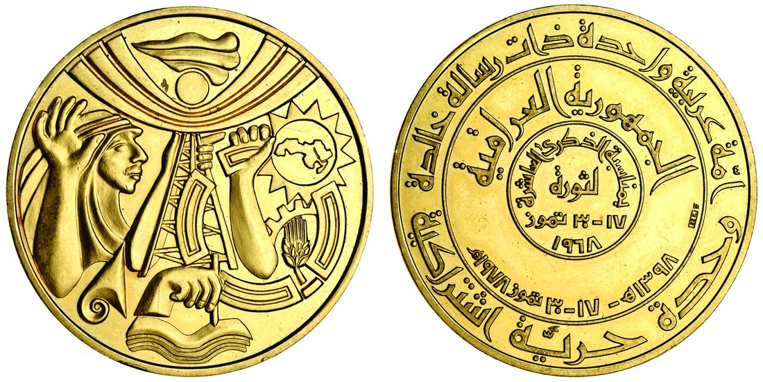 (x) Iraq, proof gold medal, 1968, on the 10th anniversary of the Revolution, 38.17g, 40mm, extremely fine