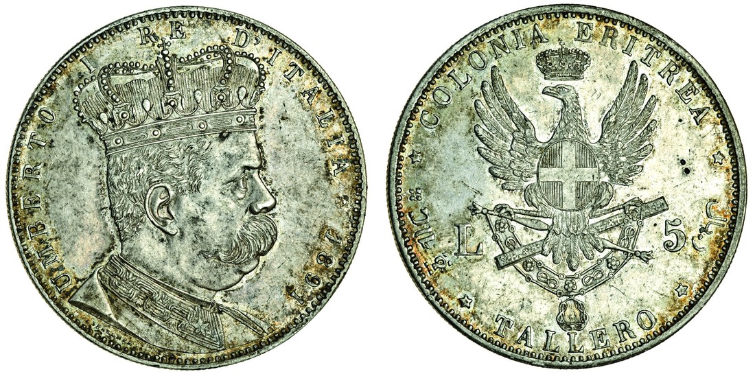(x) Italian Colonies, Eritrea, Umberto I (1878-1900), 5-Lire or Tallero 1891, crowned bust right, rev. crowned eagle (KM.4; Mont.80; Pag.630), lustrous around legend, scratches and two punches on reverse, dent to nose, extremely fine