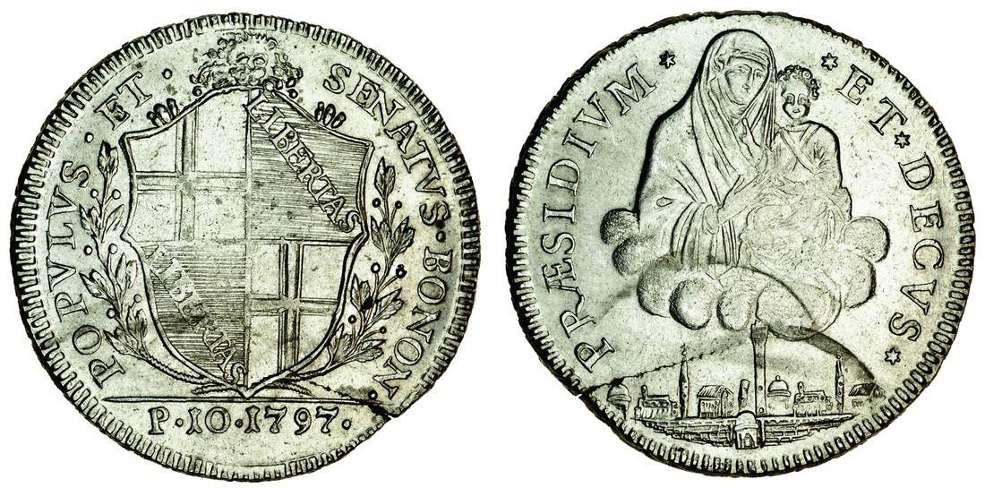 Italy, Bologna, Revolutionary Government (1796-97), 10-Paoli, 1797, popvlvs. et. senatvs. bonon., shield, rev. praesidivm* *et* decvs*, Madonna and Child over city (Dav.1359; KM 339), flan crack, good very fine